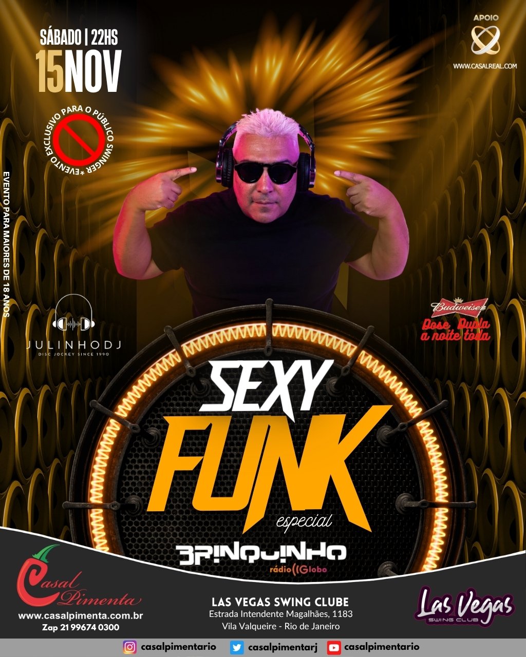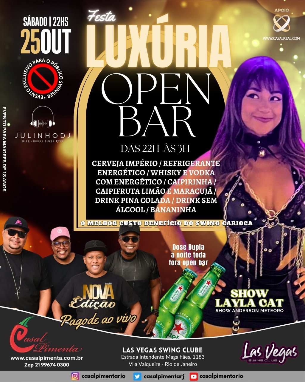 Sempre no último sábado do mês o melhor custo benefício do swing carioca! Open bar com 14 ítens, Pagode ao vivo com Grupo Nova Edição, gente bonita, animada, shows de strippers e muito vuco-vuco! Aquela moral para galera no final do mês! O que acontece em Vegas, fica em Vegas!