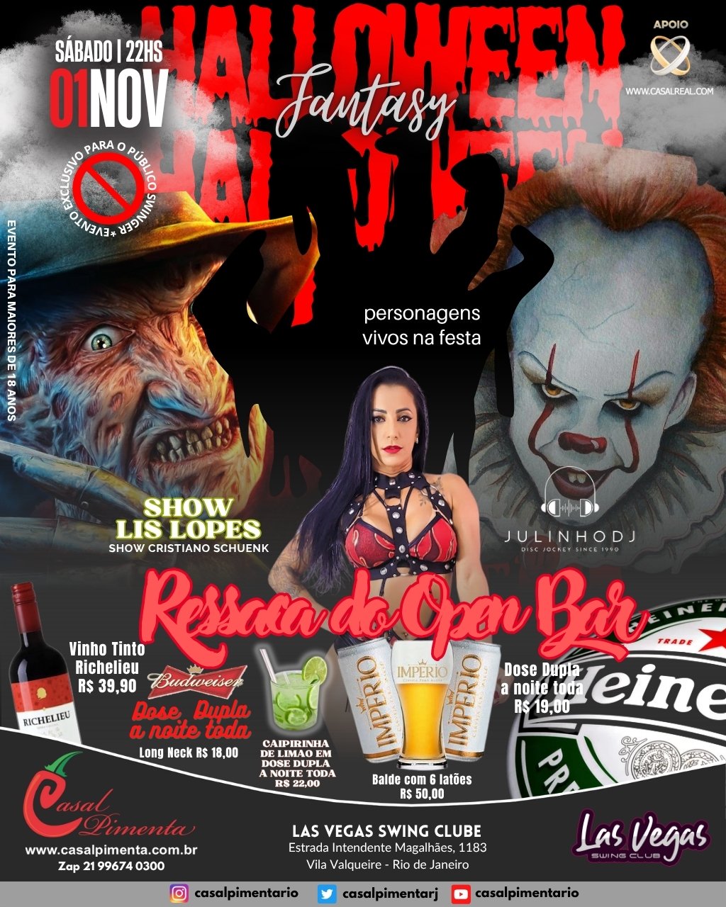 Vamos comemorar o Halloween em grande estilo com personagens vivos! Concurso fantasia mais sexy! Ressaca do Open Bar com várias promoções de bebidas! Show especial com Lis Lopes e masculino com Cristiano Schuenk! O que acontece em Vegas, fica em Vegas!
