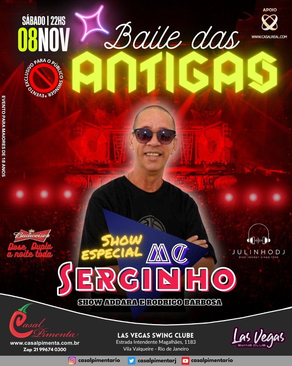 Uma noite para recordar e balançar a raba com MC Serginho ao vivo e o melhor do funk! Julinho DJ tocando todos os ritmos! Show Interativo com Addara e Rodrigo Barbosa! O que acontece em Vegas, fica em Vegas!