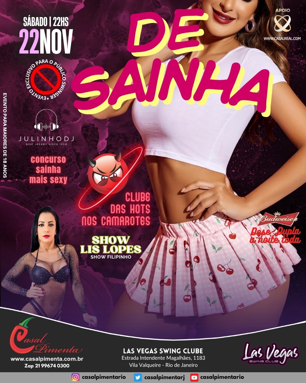Concurso sainha mais sexy entrada vip para o open bar! Clube das Hots com casais e solteiros nos camarotes! Show especial com Lis Lopes e Filipinho! O que acontece em Vegas, fica em Vegas!