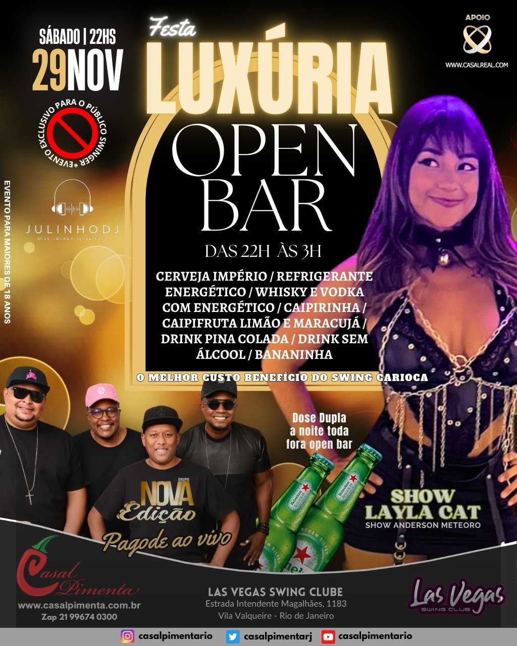 Sempre no último sábado do mês o melhor custo benefício do swing carioca! Open bar com 14 ítens, Pagode ao vivo com Grupo Nova Edição, gente bonita, animada, shows de strippers e muito vuco-vuco! Aquela moral para galera no final do mês!