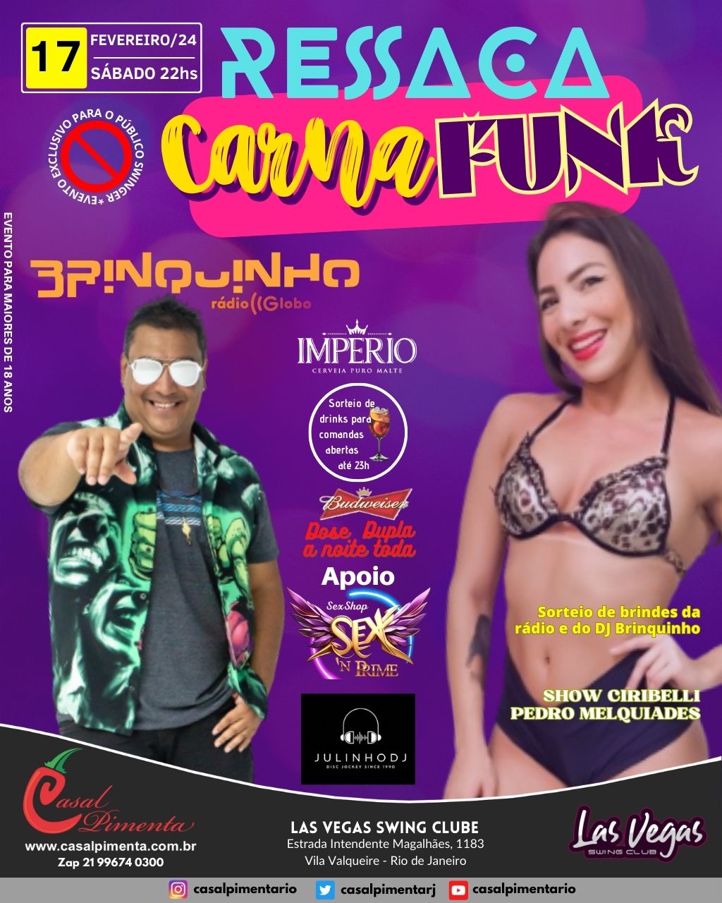 Ressaca pós carnaval com DJ Brinquinho o melhor do funk! Show Interativo com Ciribelli e Pedro Melquiades! Sorteios de brindes, drinks e do sexshop by @sexyandprime ! O que acontece em Vegas, fica em Vegas!