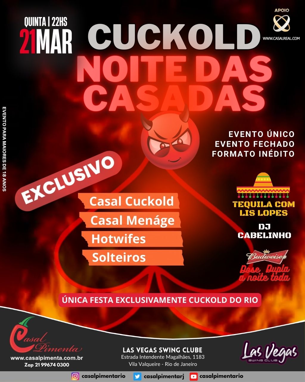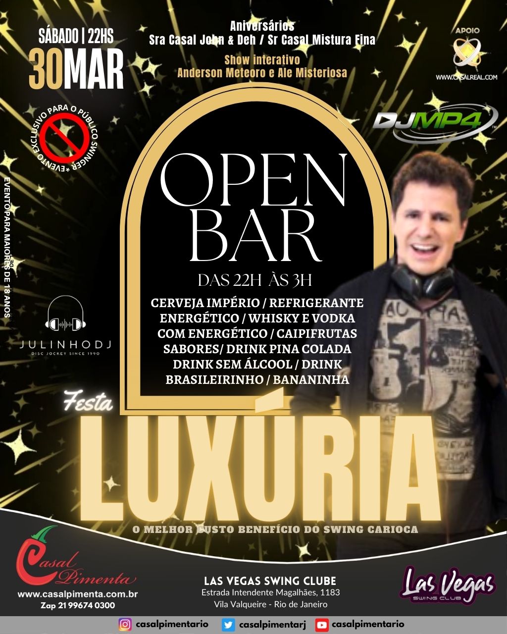 O Melhor custo benefício do swing carioca! Dois anos de festa com casa lotada, gente bonita, animada, shows de strippers e muito vuco-vuco! Aquela moral para galera no final do mês! O que acontece em Vegas, fica em Vegas!
