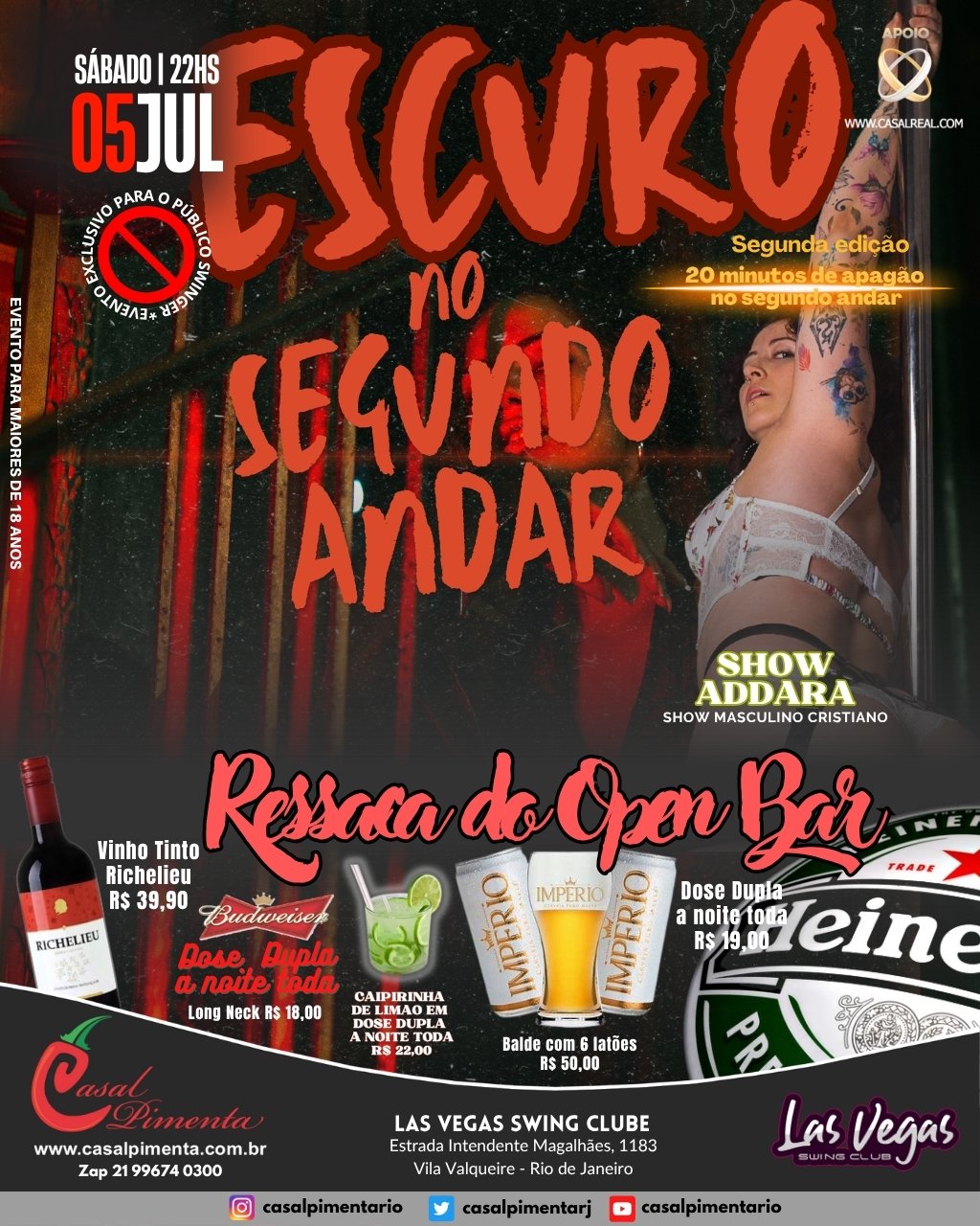 Após o sucesso do mês passado, repetimos a pedidos! Vinte minutos de apagão no segundo andar! Ressaca do Open Bar com várias promoções de bebidas! Shows especial com Addara, Show masculino Cristiano Schuenk! O que acontece em Vegas, fica em Vegas!