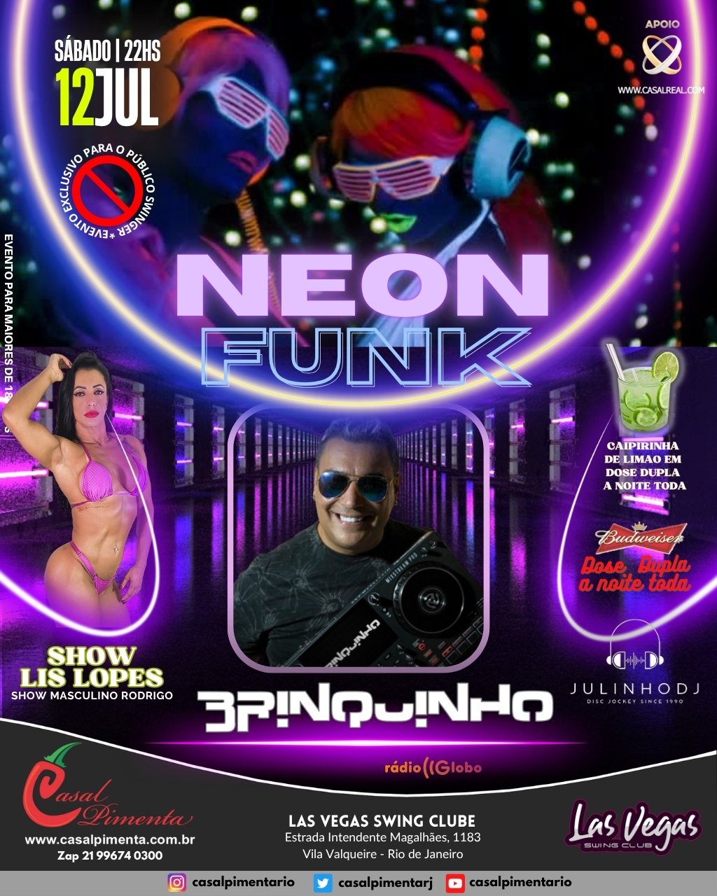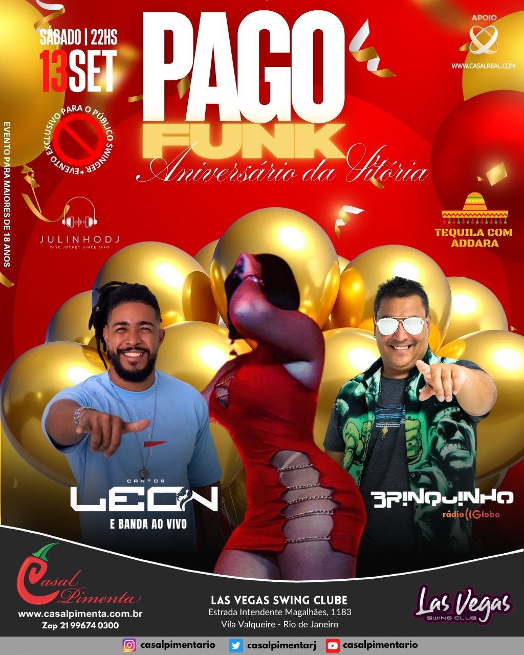 DJ Brinquinho (rádio Globo) com o melhor do funk! Show especial com Lis Lopes, show masculino Rodrigo Barbosa! Caipirinha de limão em dose dupla e noite toda! O que acontece em Vegas, fica em Vegas!