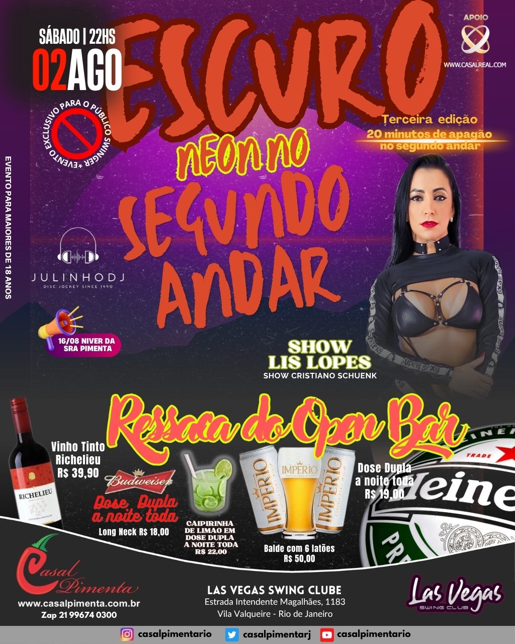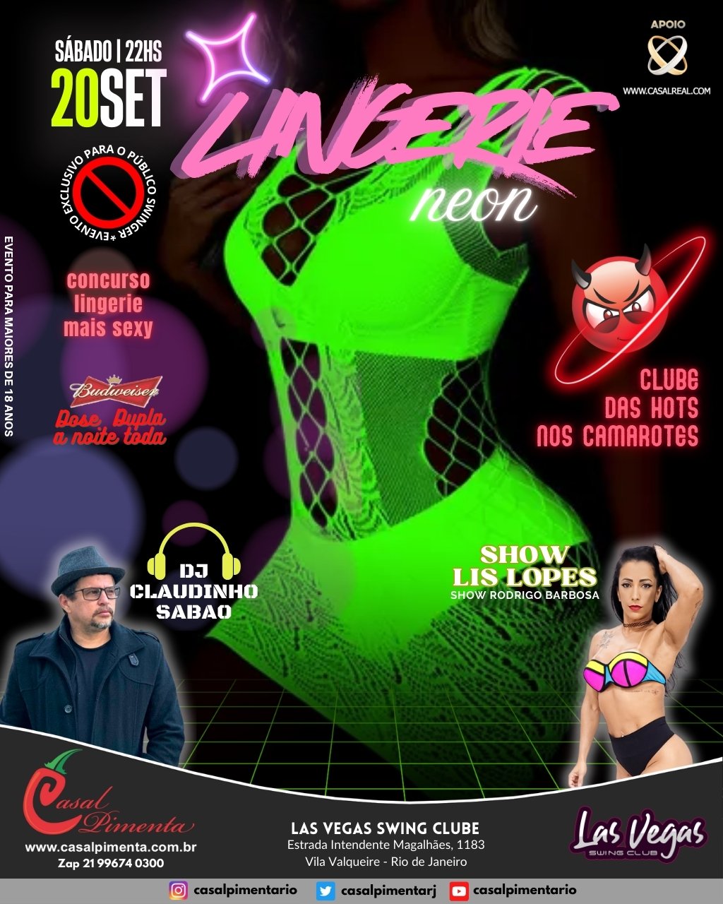 Concurso lingerie neon mais sexy entrada vip para o open bar! Clube das Hots com casais e solteiros nos camarotes! Show especial com Lis Lopes e Rodrigo Barbosa! O que acontece em Vegas, fica em Vegas!