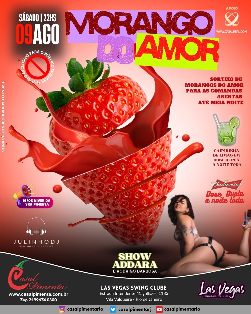 Sorteio de morangos do amor! Show com Addara e Rodrigo Barbosa! Caipirinha de limão em dose dupla e noite toda! O que acontece em Vegas, fica em Vegas!