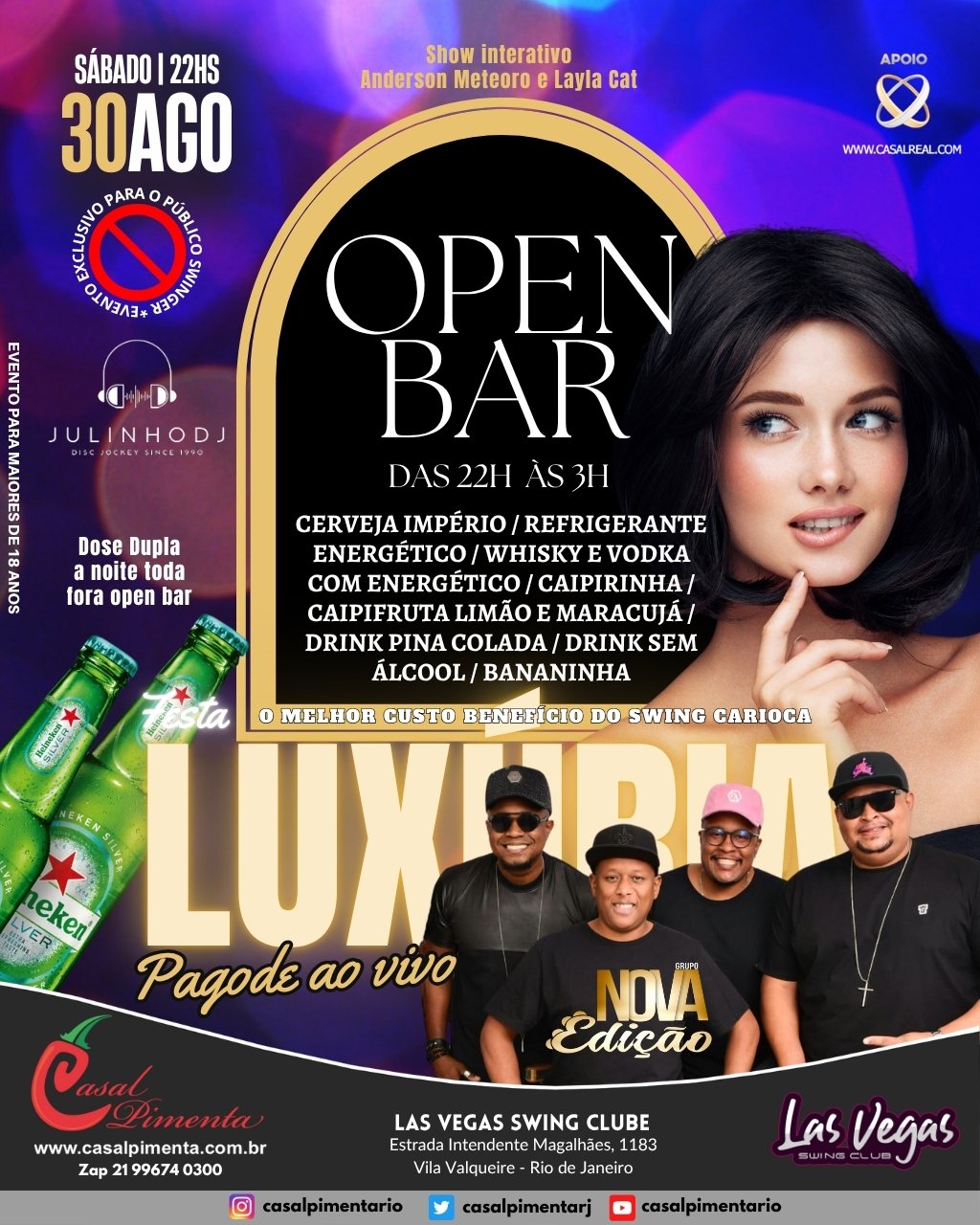 Sempre no último sábado do mês o melhor custo benefício do swing carioca! Open bar com 14 ítens, Pagode ao vivo com o Grupo Nova Edição, gente bonita, animada, shows de strippers e muito vuco-vuco! Aquela moral para galera no final do mês! O que acontece em Vegas, fica em Vegas!