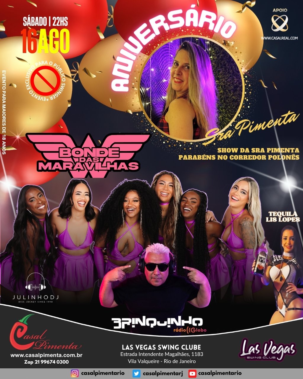 A festa mais esperada do swing carioca! Show Bonde das Maravilhas! Show da Sra Pimenta, Parabéns no Corredor Polonês, DJ Brinquinho (rádio Globo) com o melhor do funk! Tequila com Lis Lopes! O que acontece em Vegas, fica em Vegas!