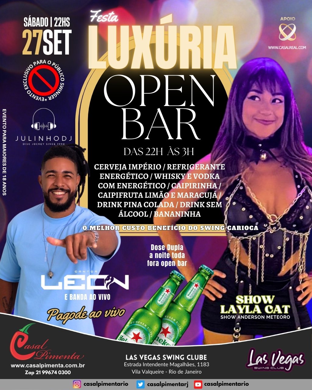 Sempre no último sábado do mês o melhor custo benefício do swing carioca! Open bar com 14 ítens, Pagode ao vivo com Leon e Banda, gente bonita, animada, shows de strippers e muito vuco-vuco! Aquela moral para galera no final do mês! O que acontece em Vegas, fica em Vegas!