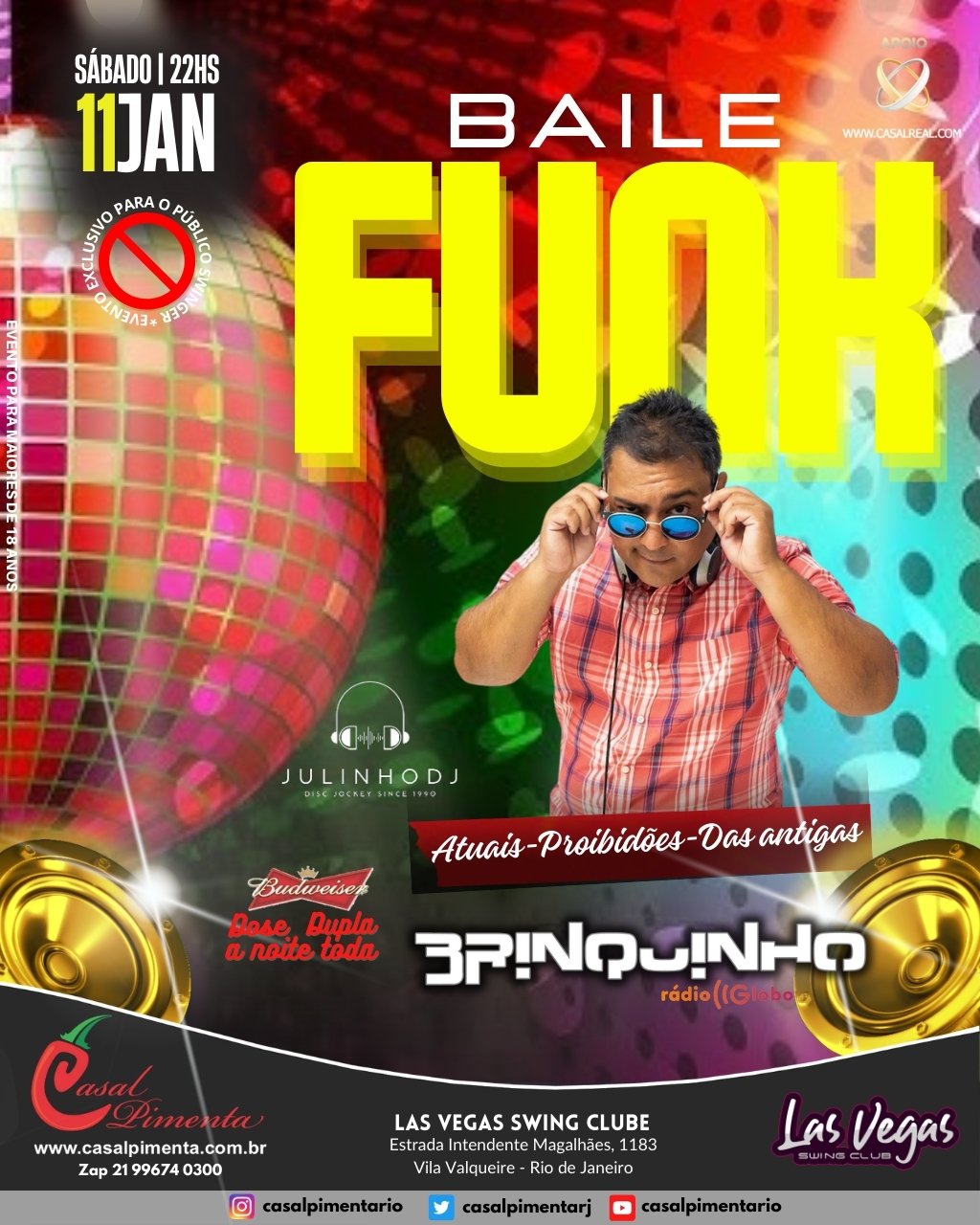 DJ Brinquinho daRádio Globo com o melhor do Funk atual, das antigas e proibidões para a mulherada rebolar até o chão! Participação especial MC Manuzinhah! Shows interativos com Ale Misteriosa e Rodrigo Barbosa! Sorteios de Brindes da Rádio e drinks! Julinho DJ tocando todos os ritmos! O que acontece em Vegas, fica em Vegas!