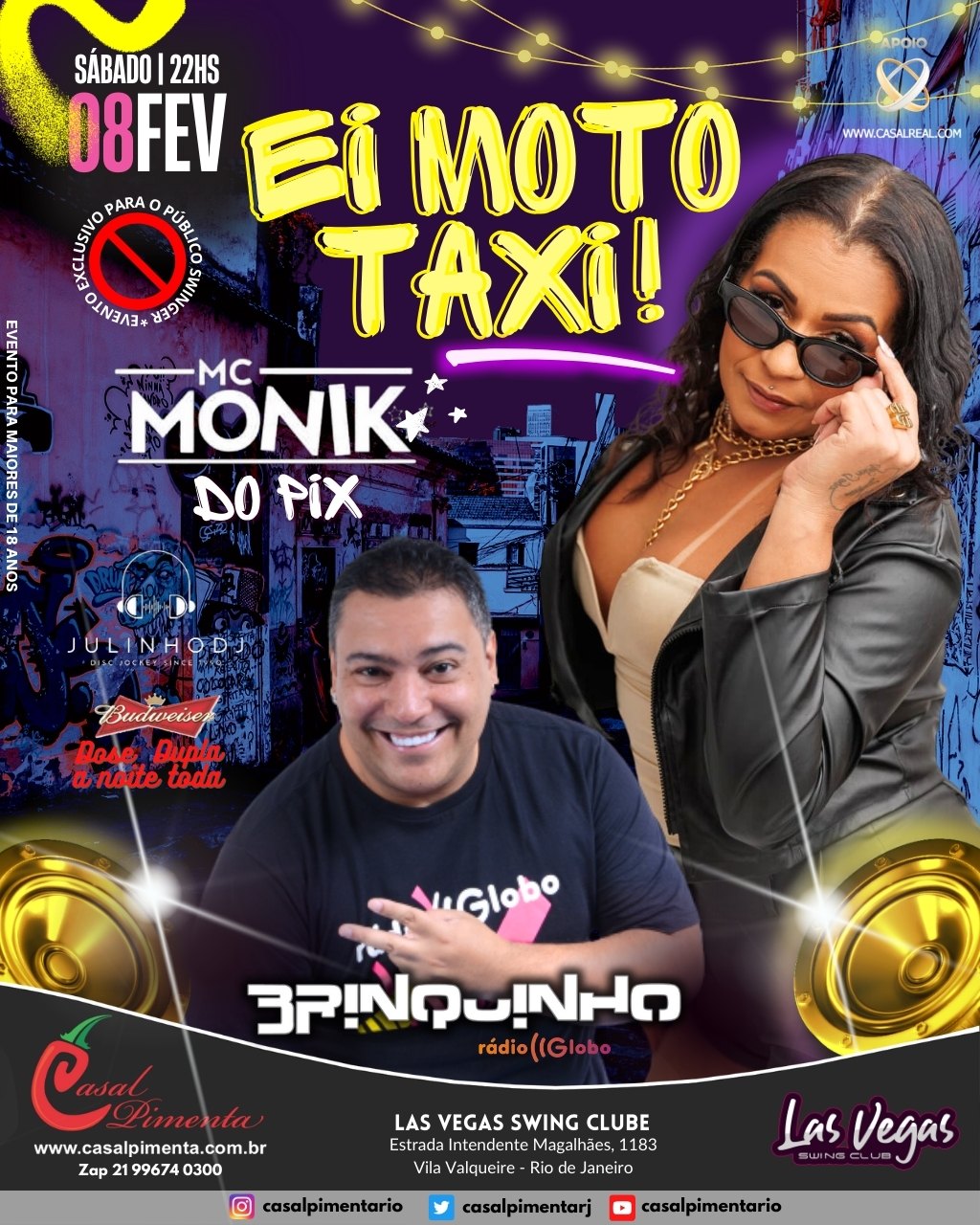 A festa com a música mais bombada de 2024! MC Monique do Pix e DJ Brinquinho da Rádio Globo com o melhor do Funk! Shows interativos com Addara e Rodrigo Barbosa! O que acontece em Vegas, fica em Vegas!