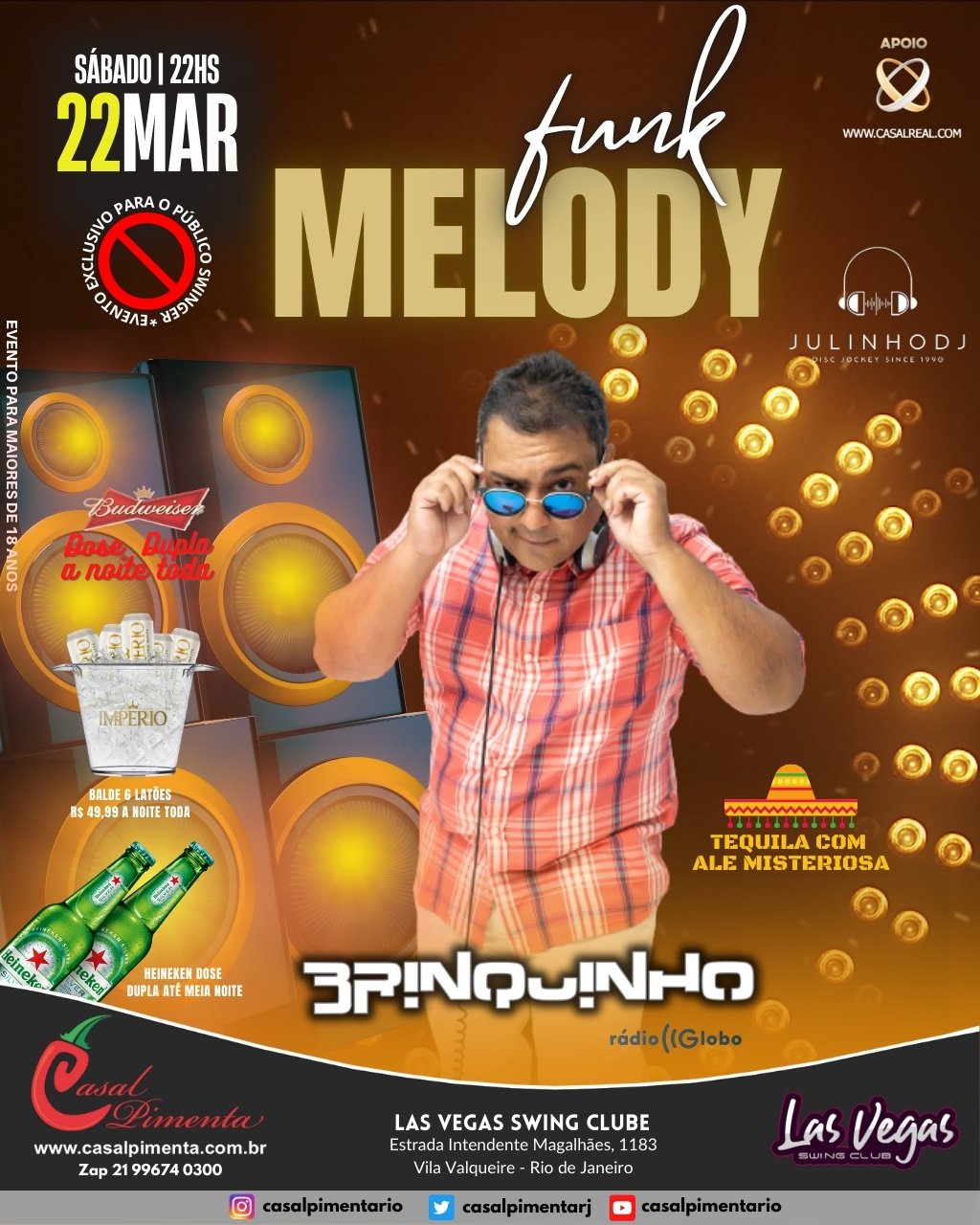Bora balançar a raba com DJ Brinquinho da Rádio Globo com o melhor do Funk Melodie! Show de tequila com Ale Misteriosa! Sorteio de brindes da rádio! O que acontece em Vegas, fica em Vegas!