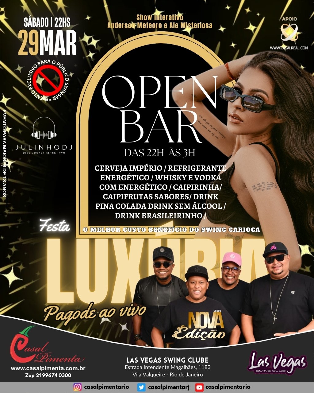 O Melhor custo benefício do swing carioca! Open bar com 14 ítens, Pagode ao vivo com o Grupo Nova Edição em clima de carnaval, gente bonita, animada, shows de strippers e muito vuco-vuco! Aquela moral para galera no final do mês! O que acontece em Vegas, fica em Vegas!