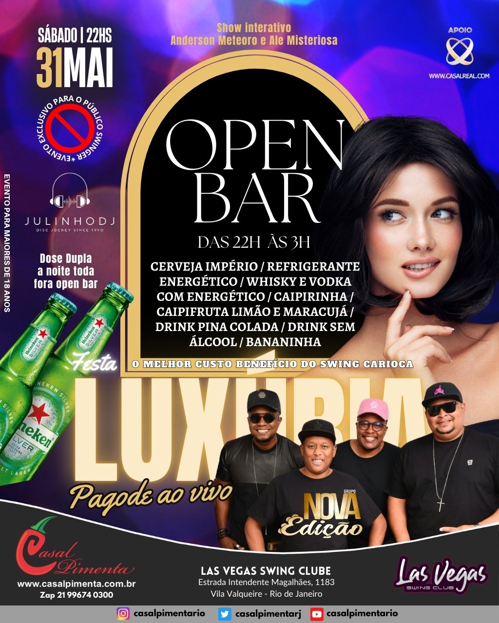 Sempre no último sábado do mês o melhor custo benefício do swing carioca! Open bar com 14 ítens, Pagode ao vivo com o Grupo Nova Edição, gente bonita, animada, shows de strippers e muito vuco-vuco! Aquela moral para galera no final do mês! O que acontece em Vegas, fica em Vegas!