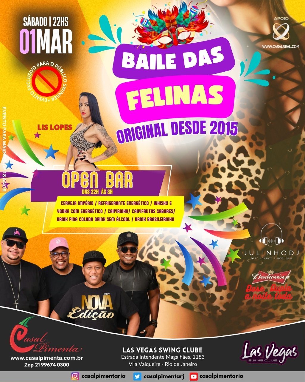 Baile das Felinas original desde 2015 o único com open bar no swing carioca! Open bar com 14 ítens, Grupo nova edição com carnaval ao vivo, Show interativo com Lis Lopes, concurso da felina mais sexy e sorteios! O que acontece em Vegas, fica em Vegas!