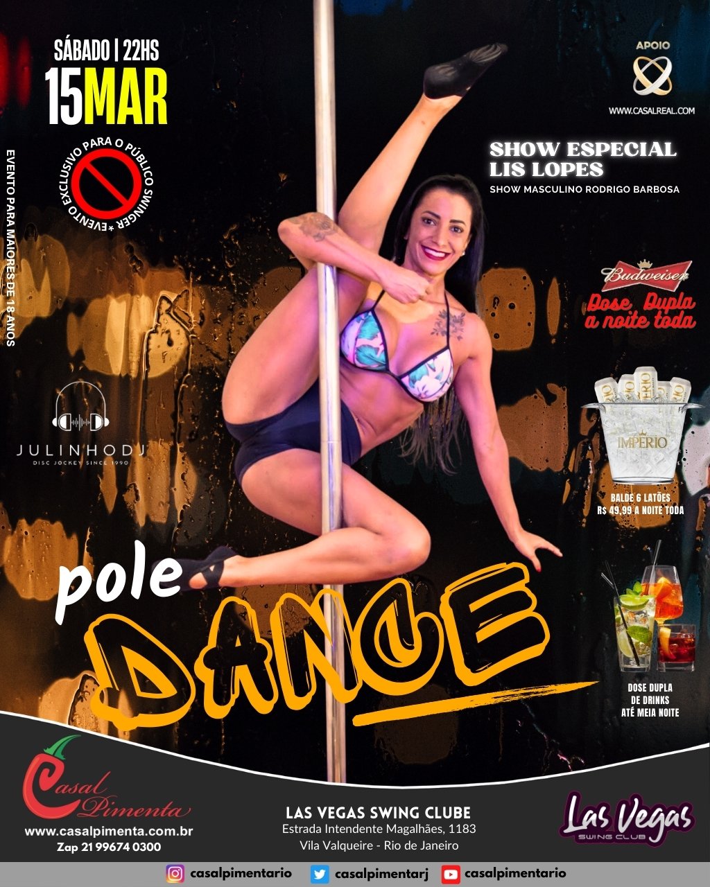 Uma noite para se soltar no pole dance! Show especial com Lis Lopes! Show Masculino Rodrigo Barbosa! Drink dose dupla até meia noite! O que acontece em Vegas, fica em Vegas!