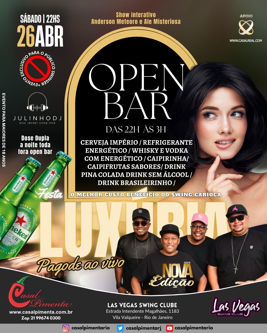 O Melhor custo benefício do swing carioca! Open bar com 14 ítens, Pagode ao vivo com o Grupo Nova Edição, gente bonita, animada, shows de strippers e muito vuco-vuco! Aquela moral para galera no final do mês! O que acontece em Vegas, fica em Vegas!