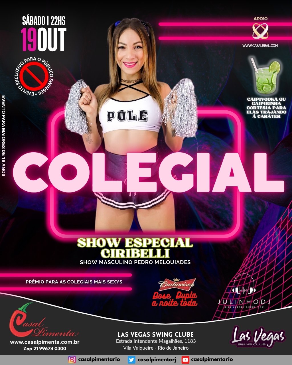Vamos viver esse fetiche intensamente! Caipirinha ou Caipivodka cortesia para elas à caráter! Prêmio para as colegiais mais sexys! Show Feminino interativo com Ciribelli Scarlet! Show masculino interativo com Pedro Melquiades! O que acontece em Vegas, fica em Vegas!