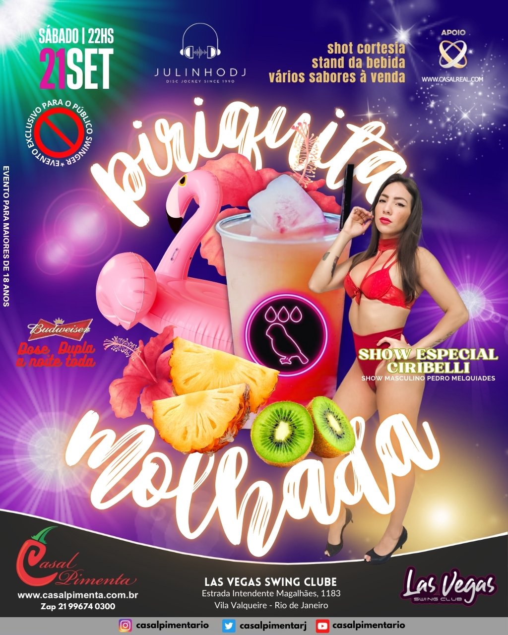 Uma noite com explosão de sabores! Shot cortesia da bebida Piriquita Molhada! Show Feminino interativo com Ciribelli Scarlet! Show masculino interativo com Pedro Melquiades! O que acontece em Vegas, fica em