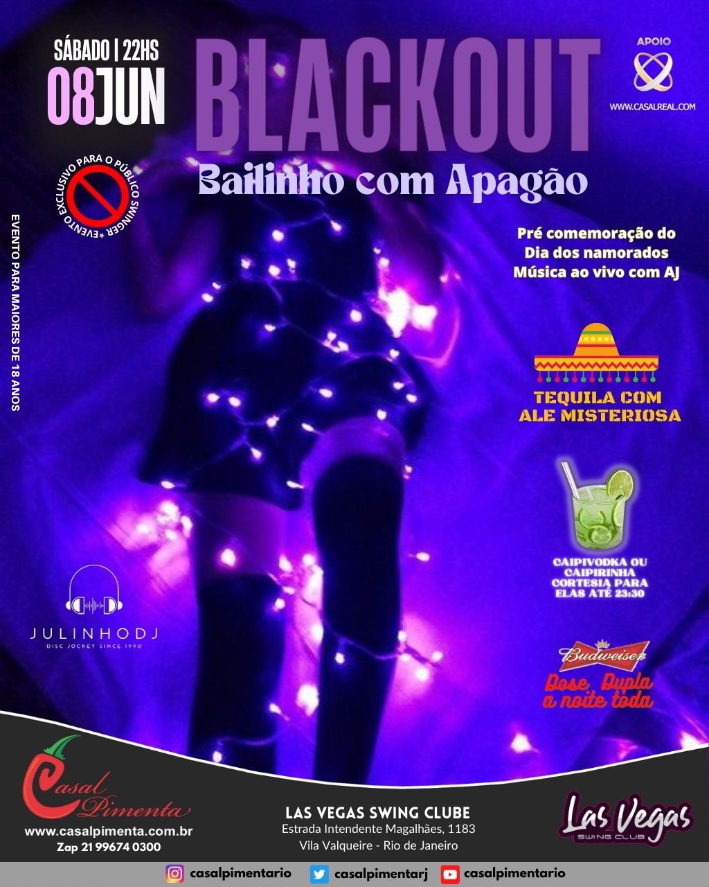 Apagão geral na Boate e Bailinho rolando ao vivo com AJ na pré comemoração do dia dos namorados! Drink cortesia para elas! Tequila com Ale Misteriosa! O que acontece em Vegas, fica em Vegas!