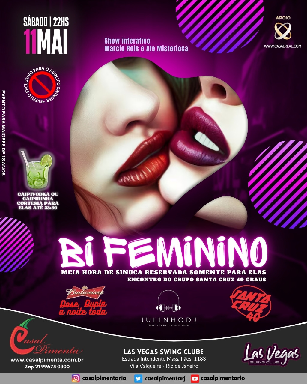 A noite mais esperada por casais, homens e mulheres! Meia hora de sinuca liberada apenas para elas! Caipivodka ou Caipirinha cortesia para elas! Encontro do grupo Santa Cruz 40 Graus! Shows interativos com Cristiano e Ale Misteriosa! O que acontece em Vegas, fica em Vegas!