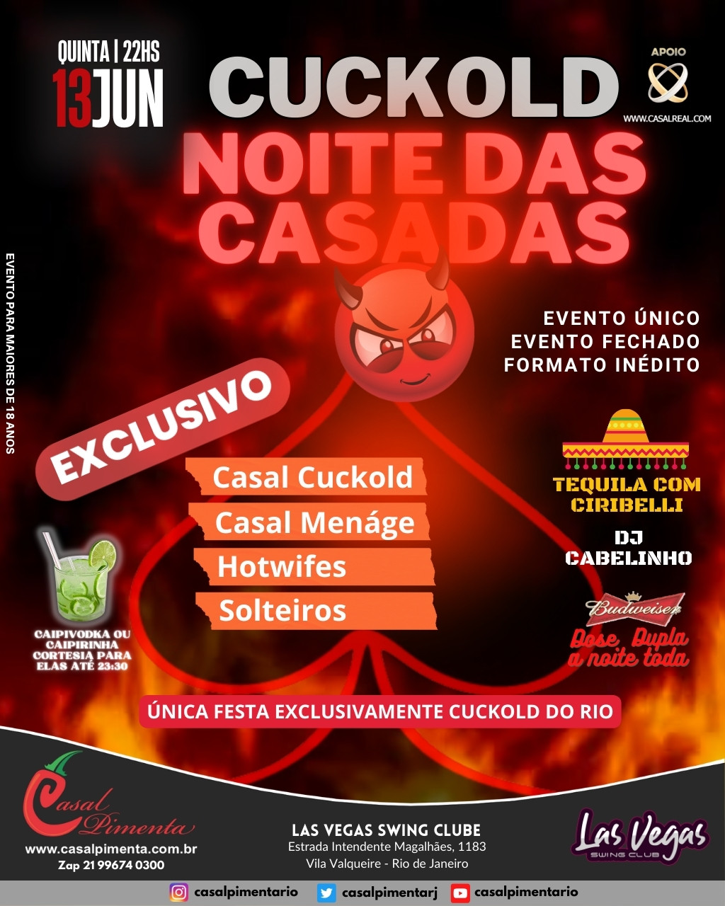 Evento FECHADO com FORMATO INÉDITO E EXCLUSIVO para o público adepto, praticante ou simpatizante do Ménage Masculino e Cuckold! Voltado exclusivamente para Solteiros, Casais ménage masculino, Cuckold e Hotwifes! Única festa realmente cuckold do Rio!