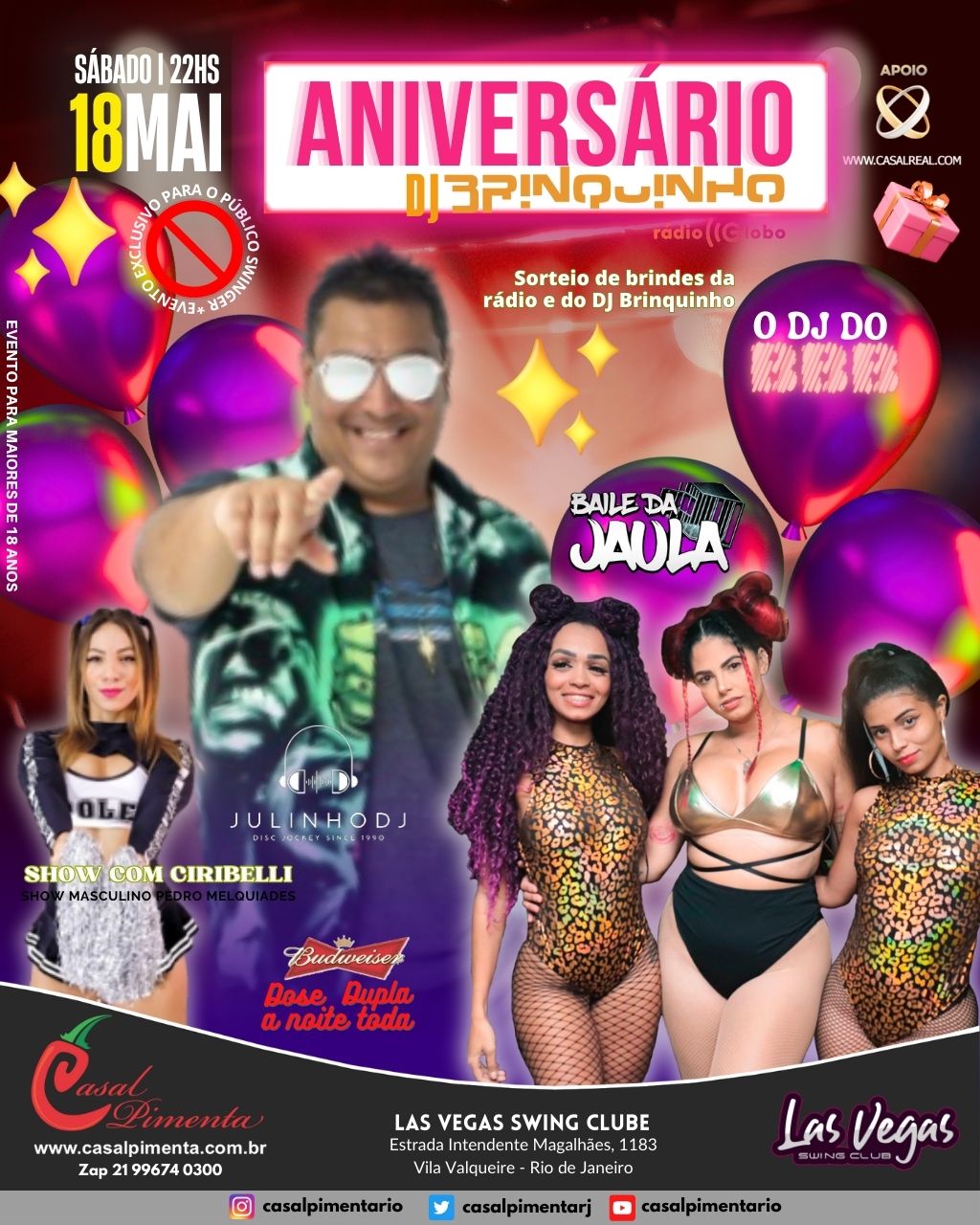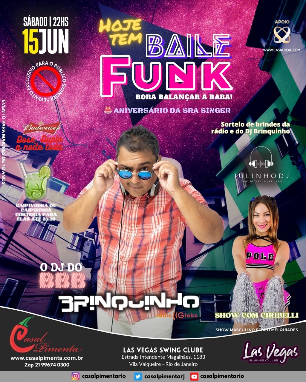 DJ Brinquinho do BBB (Rádio Globo) com o melhor do funk! Niver da Sra Singer! Shows interativos com Pedro Melquiades e Ciribelli Scarlet! Sorteios de Brindes da Rádio e drinks! O que acontece em Vegas, fica em Vegas!