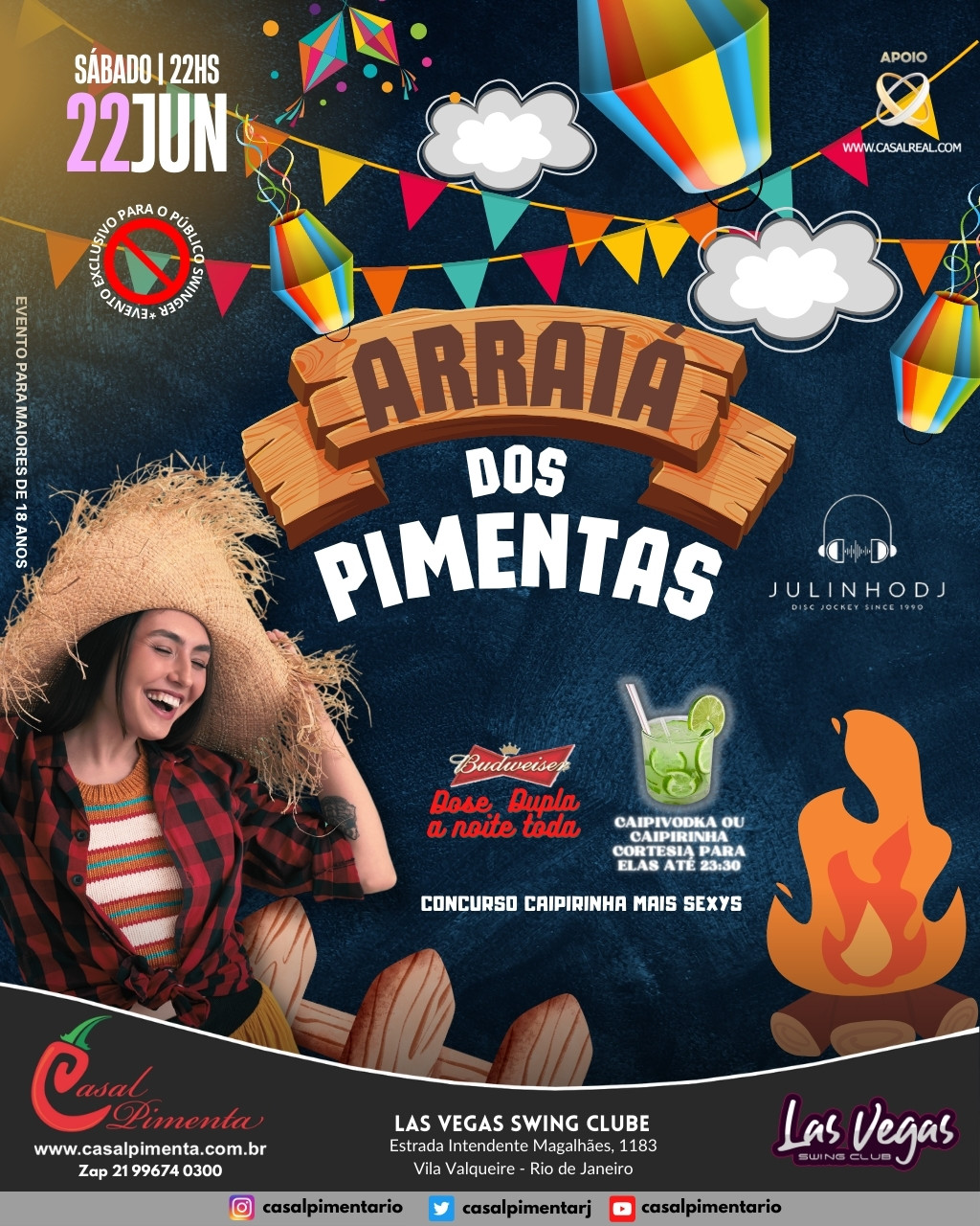 Casa decorada! Totem para foto! Música ao vivo! Drink cortesia para elas! Concurso da Caipirinha mais sexy! Shows interativos! Várias surpresas! O que acontece em Vegas, fica em Vegas!