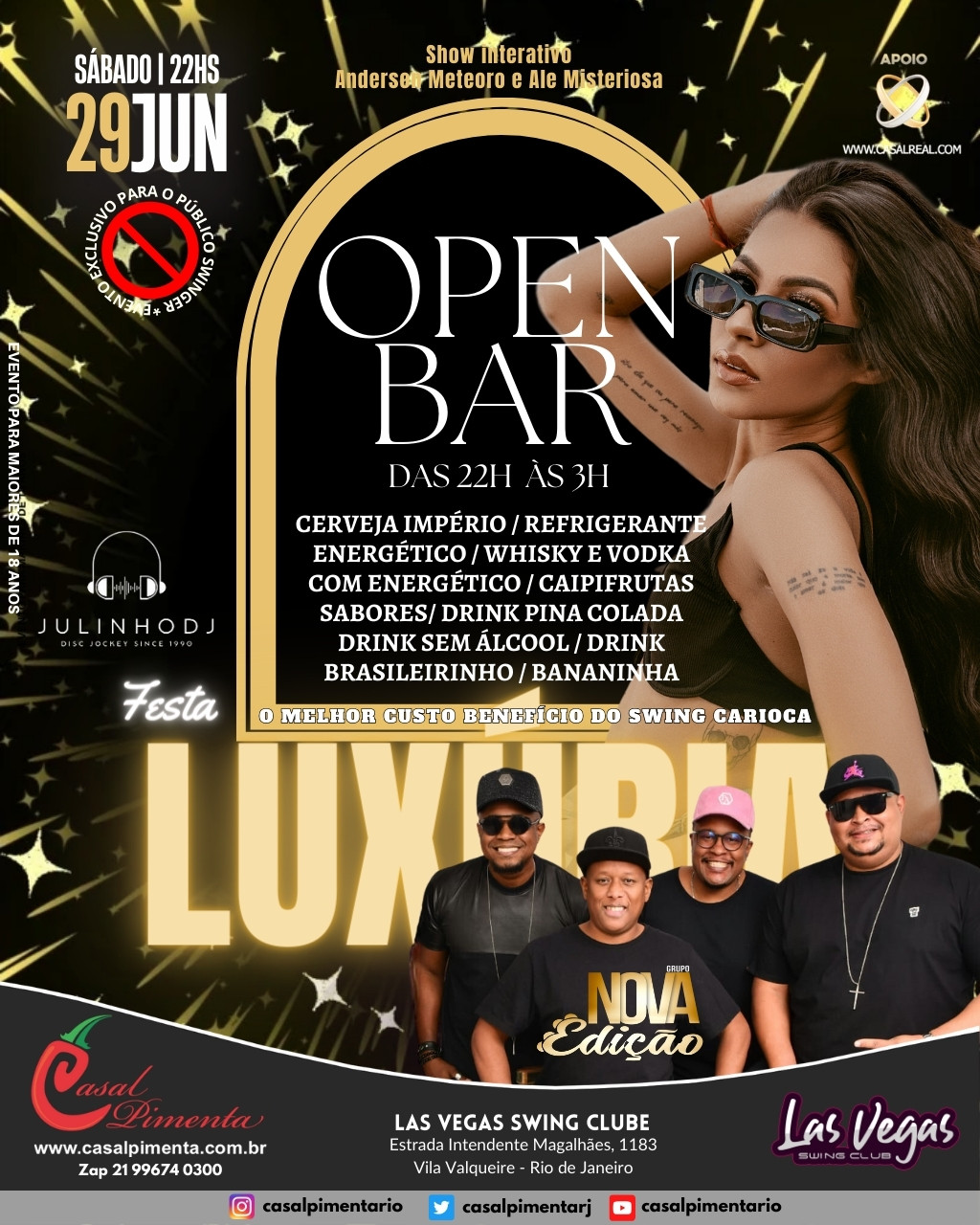 O Melhor custo benefício do swing carioca! Open bar com 14 ítens, Pagode ao vivo com o Grupo Nova Edição, gente bonita, animada, shows de strippers e muito vuco-vuco! Aquela moral para galera no final do mês! O que acontece em Vegas, fica em Vegas!